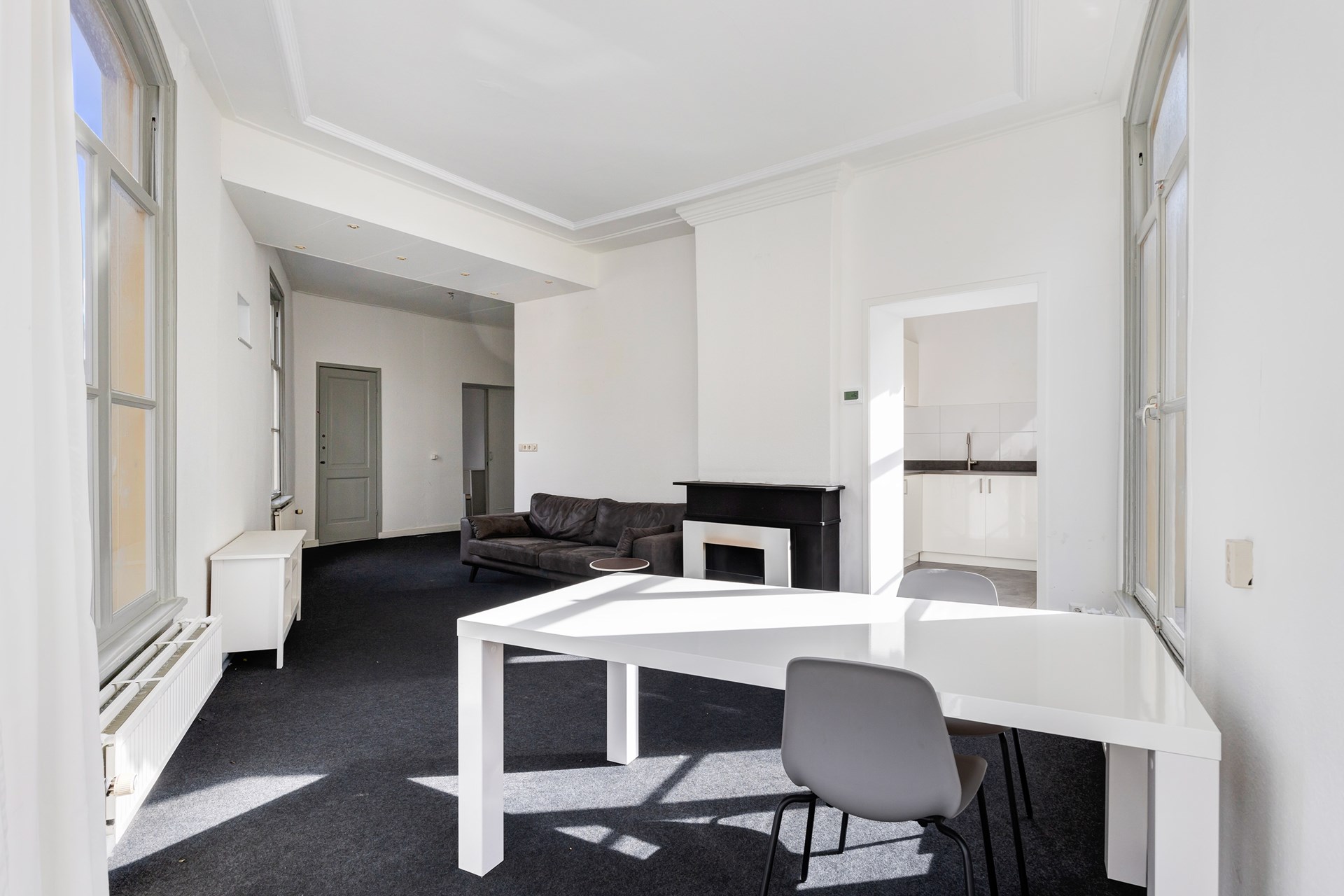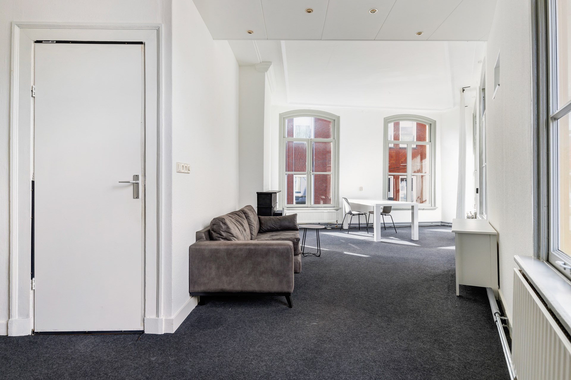 Nieuwstraat 2B: Overloop en ruime woonkamer met toegangsdeur naar het balkon.