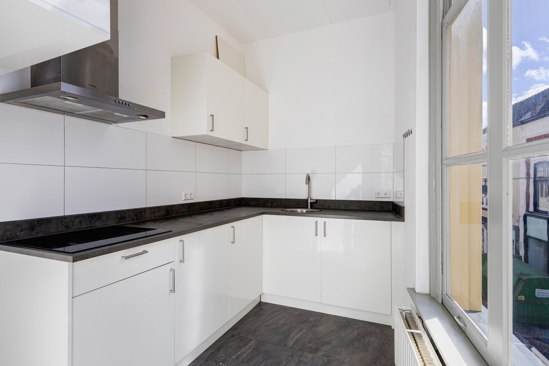 Nieuwstraat 2B via de buitentrap toegang naar deze woning. Entree, keuken, badkamer, slaapkamer en trap naar de tweede en derde verdieping.