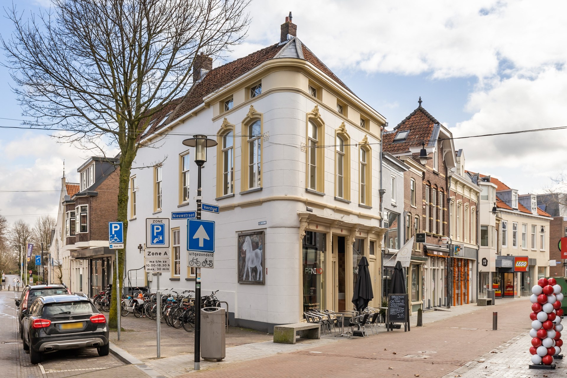 Aan de poort van de Voorstraat staat een wit gepleisterde winkelwoonhuis in neoclassicistische stijl en is markant gelegen op de hoek van Voorstraat en de Nieuwstraat. Het pand bestaat twee bouwlagen met een mezzania onder een pannegedekt schilddak dat aan de achterzijde eindigt in een tuitgevel. Het bevat een winkel met dag-horeca met een half onderkelderd werkruimte en daglicht toetreding, één appartement en één woning met eigen entree.
