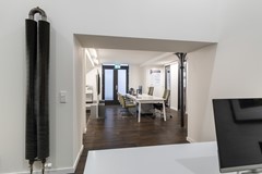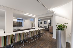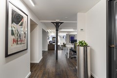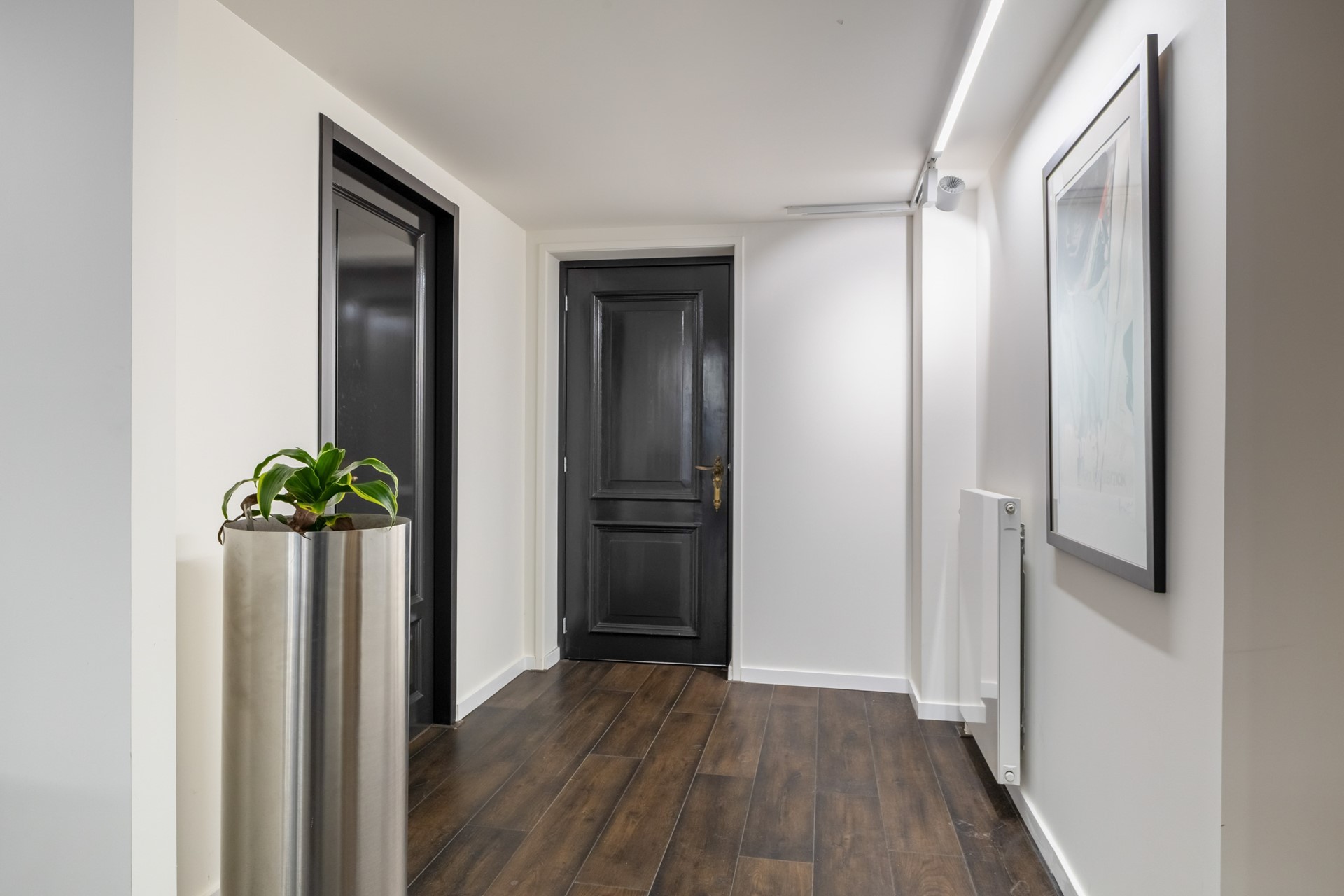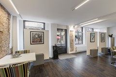 This move-in-ready and representative office space offers a professional and highly flexible working environment. Featuring its own street-facing entrance, double French doors on the side, and large windows. The interior boasts a sleek modern design enhanced with original 17th-century elements—such as the hand-molded bricks revealed during renovation—and a striking antique-style chandelier, giving the space a truly unique and characterful atmosphere.