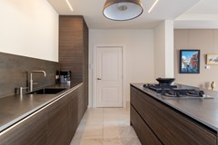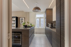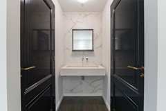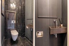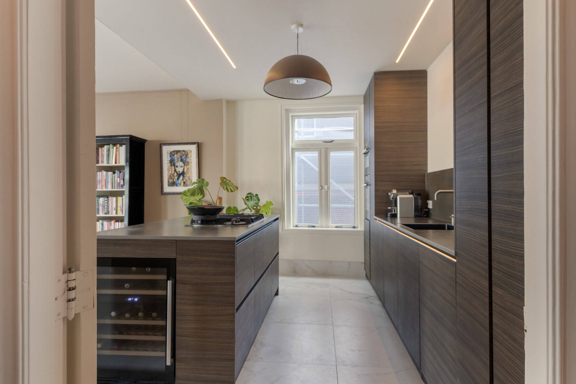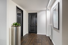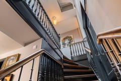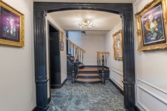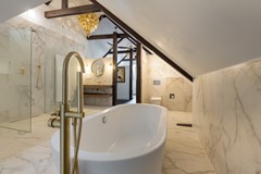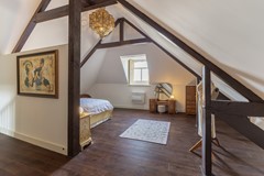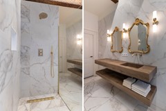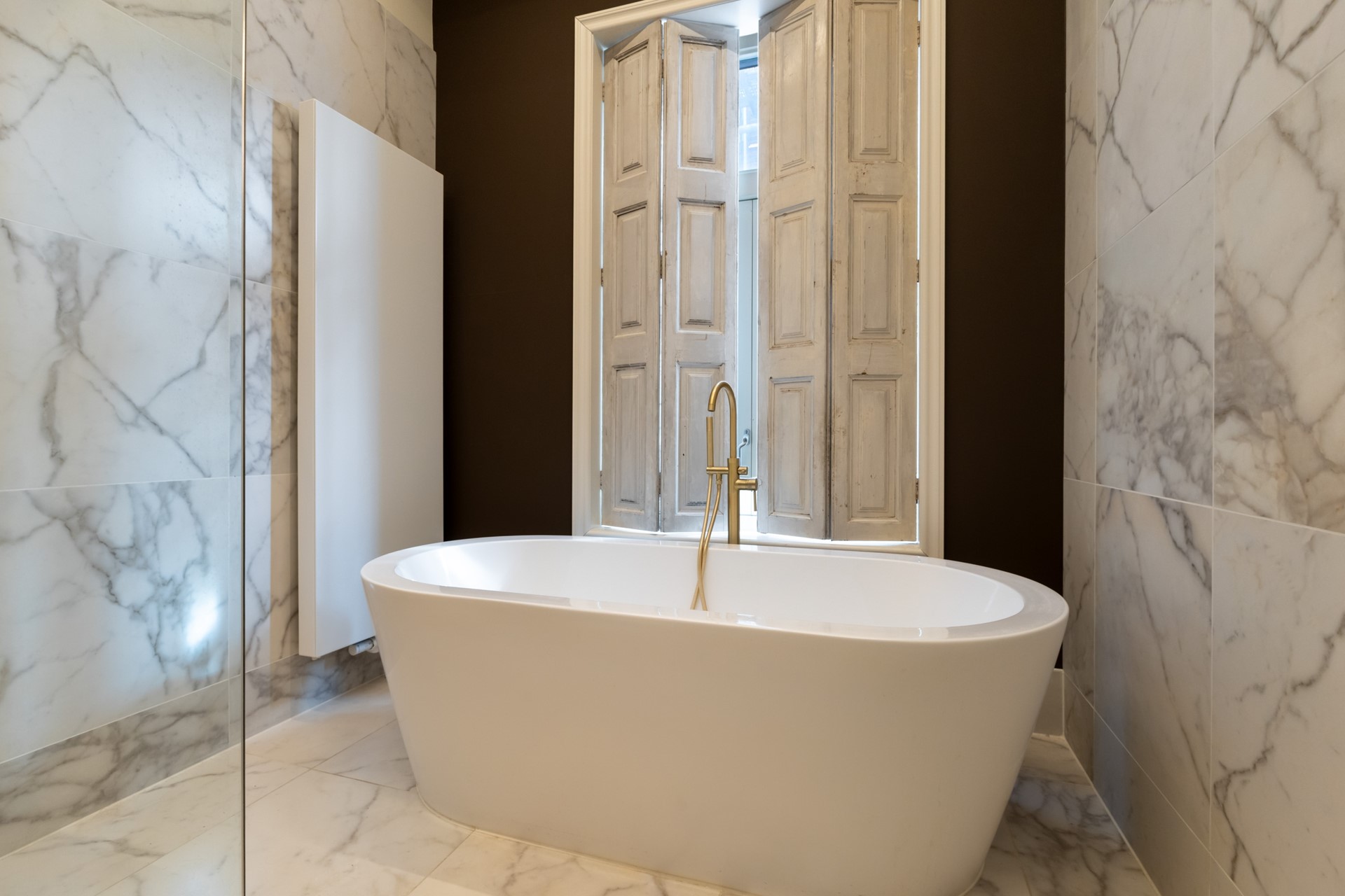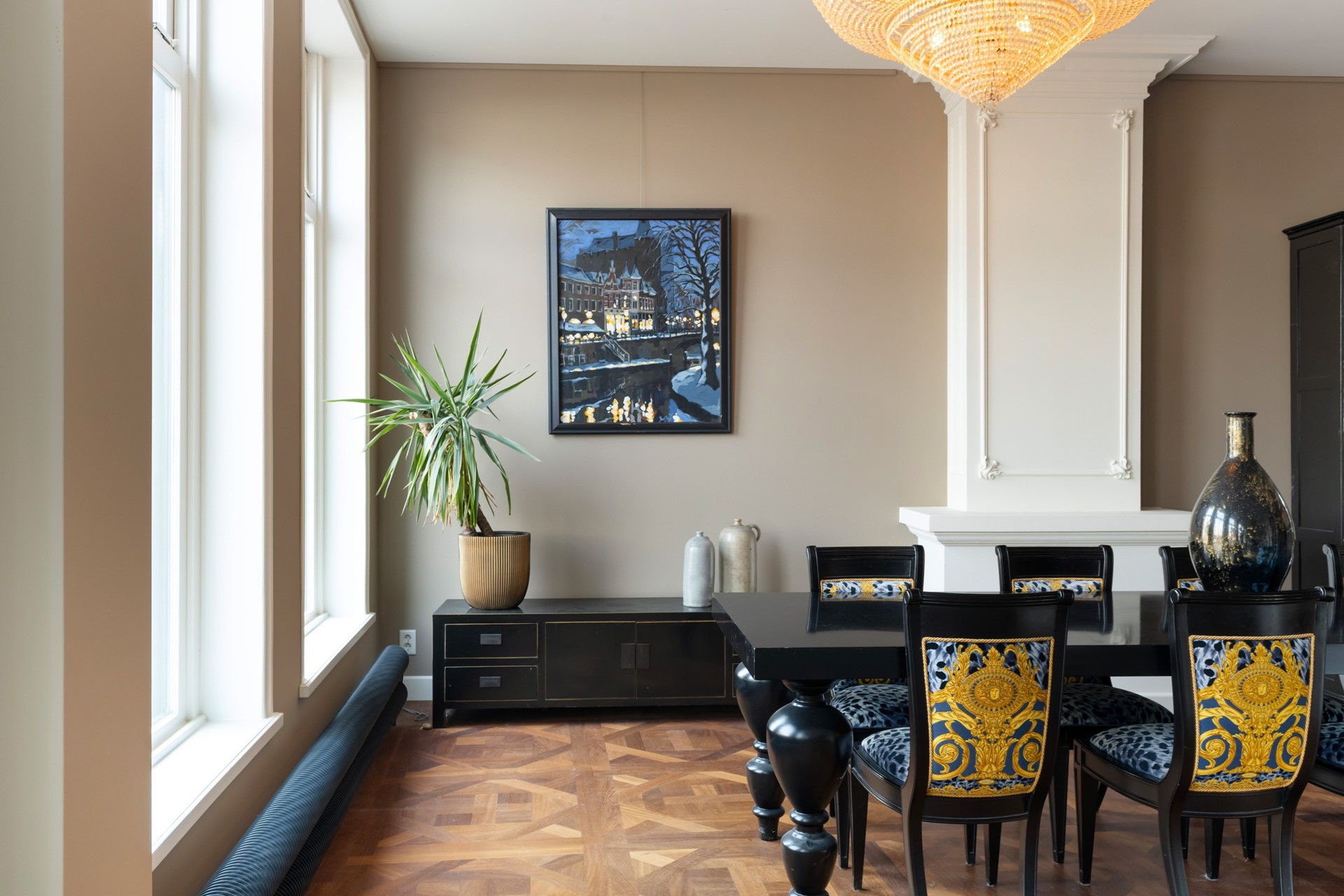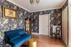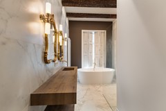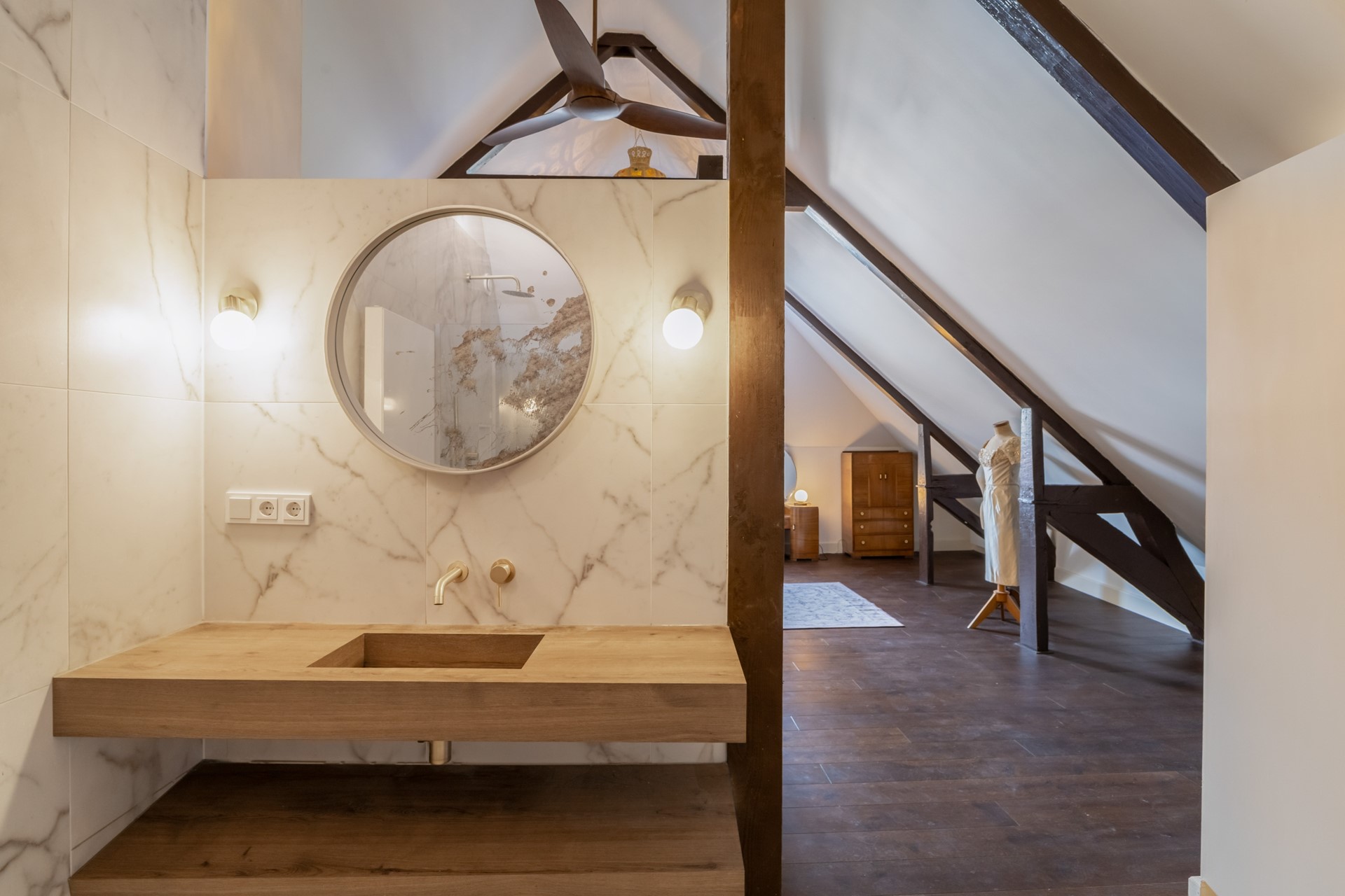 Along the stately hallway, you’ll find a separate toilet and a truly remarkable bathroom that features an atmospheric, authentic beam ceiling with unique decorative painting. These expertly restored beams, adorned with early 17th-century floral motifs and borders, are similar to those found in Amsterdam’s Oude Kerk (1628) and Huis ten Bosch in Maarssen (1629). Together with antique wooden shutters, they create a perfect blend of historical charm and luxurious comfort.