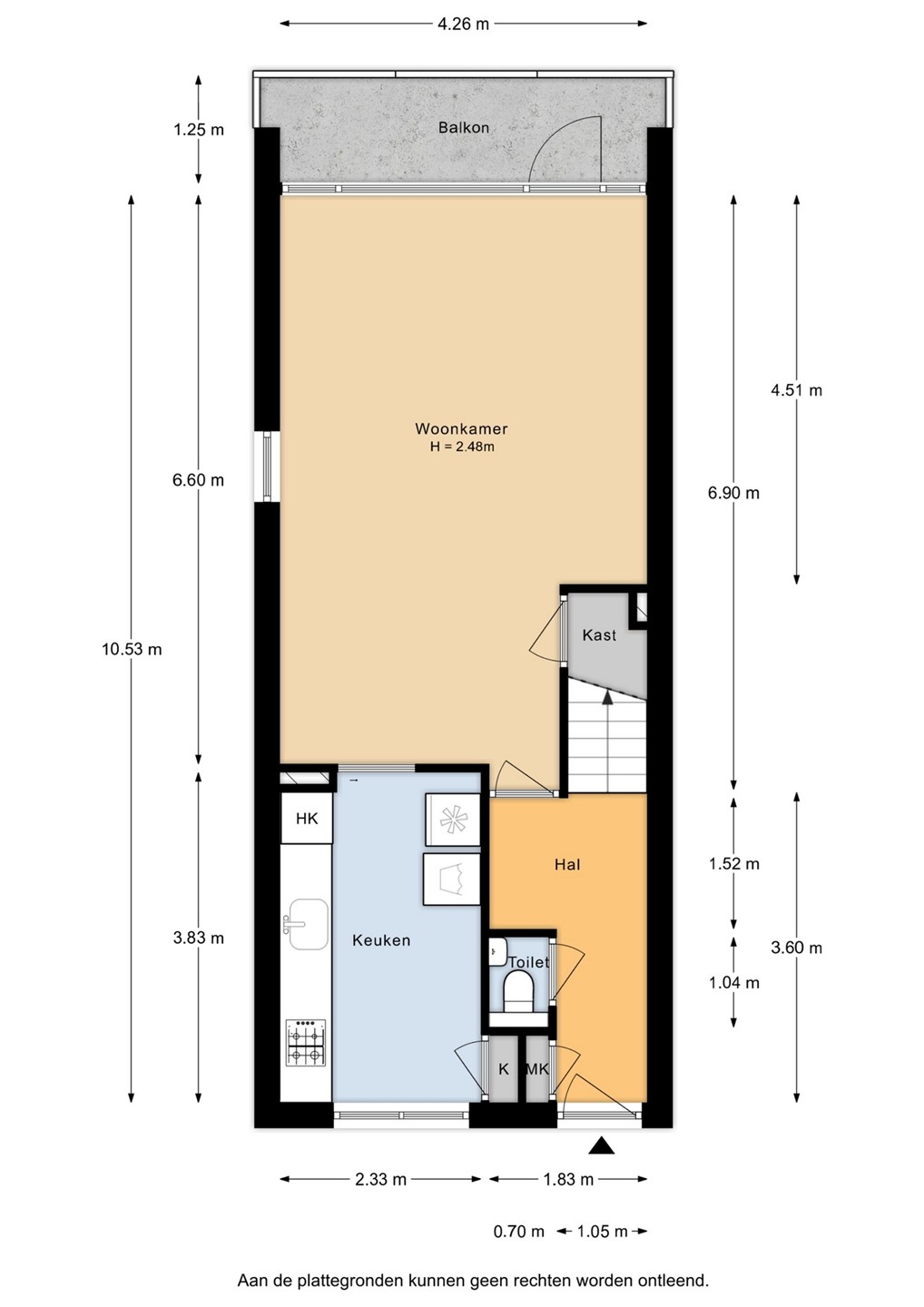 Via het trappenhuis bereikt u de galerij aan de achterzijde van het complex. Helemaal aan het einde hiervan vindt u de entree van uw eigen appartement. U komt binnen in een verzorgde hal met meterkast, trapopgang en een modern toilet met fontein. Vanuit de hal loopt u direct door naar de woonkamer.